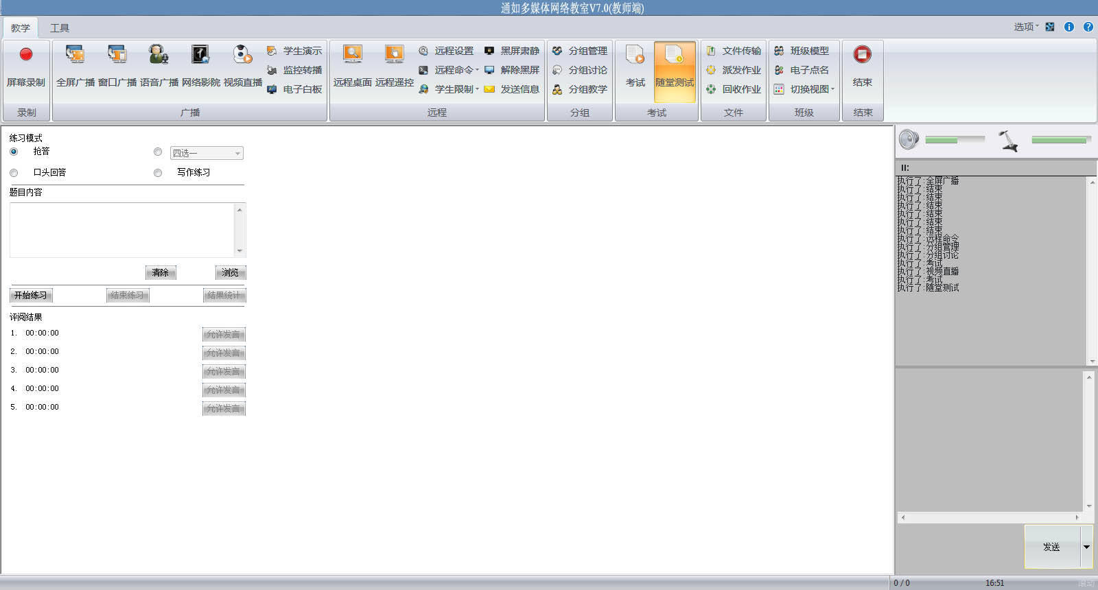 「通如多媒体教学系统V7.0」不仅提供了多样的广播功能(如:全屏广播、窗口广播、语音广播、客户端转播、电子白板、网络影院)还包含了多种实用的教学工具,诸如电子点名、远程监看、远程遥控、电子白板、远程命令、收发作业等。